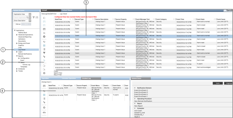 Displays the combined data from the Activity Log and Event Log. By clicking the drop-down arrow, a menu with the following options displays: Hide Column - Hides the column. Select Column - Displays the Select Columns dialog box Remove Filters - Removes any online filters (if applied) on the column. Custom Filter - Displays the Custom Filter dialog box. Selection Filter - Applies only if the column displays ENUM data. Displays a list of data entries for the column. See the List of ENUM columns section in Custom Filter for a list of columns of type ENUM. Date Filters - Applies only if the column displays date/time data. Allows you to filter data on the basis of date and time.