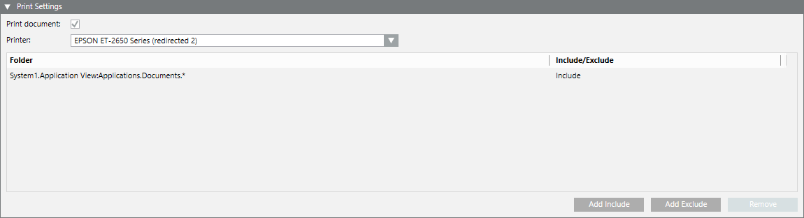 Folder: Sets one or multiple document folders that contain the document-related items to be printed. You can include or exclude document folders, or cancel the operation.