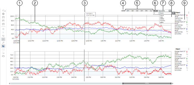 The most recent value with information related to the point, date/time, quality displays at the intersection of the time bar and the graph representing the point.