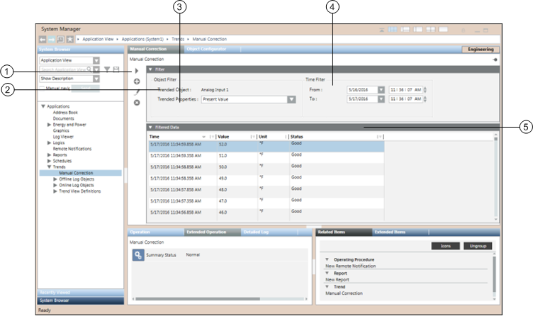 The Manual Correction application allows you to add, modify, and delete values of trended properties of trended objects that are logged in online as well as offline trends.