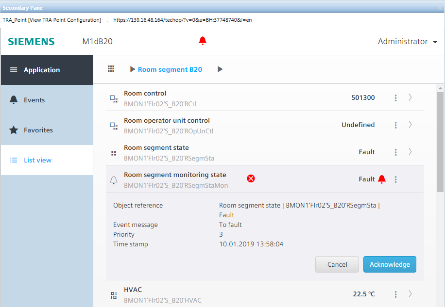 NOTE: The alarm can be acknowledged directly in the Command column. - Select the alarm and in the Source column, click the text displayed.