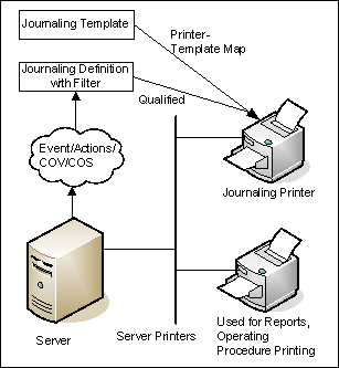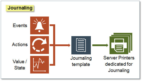 Journaling uses a dedicated Server printer called as journaling printer. Software printers are not supported by journaling printing. The journaling printer must be mapped to a journaling template that defines formatting parameters. Finally the journaling printer must be linked to a journaling definition that determines its contents.