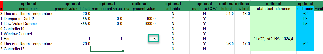 - Define the maximum stage of the fan *TxG*,TxG_BA_3147,4 for a 2-stage fan. This value is used if no value is defined in the max-present-value column.