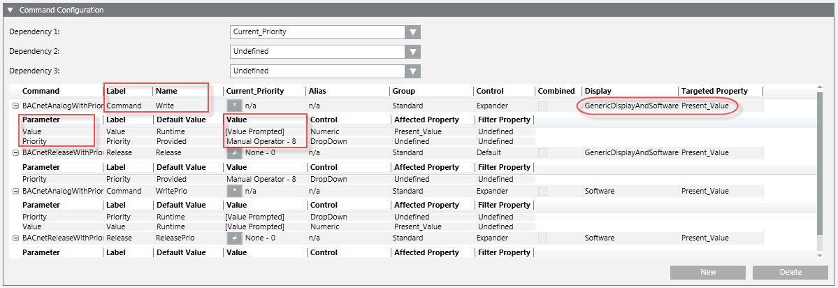 - Command with multiple command parameters across different command controls. For example, a Numeric control for the Value; a Numeric control for the Priority, and a Send button to command your Priority Array property. A user edits the value of all the parameters individually and then sends the command with all the values using a Send button.