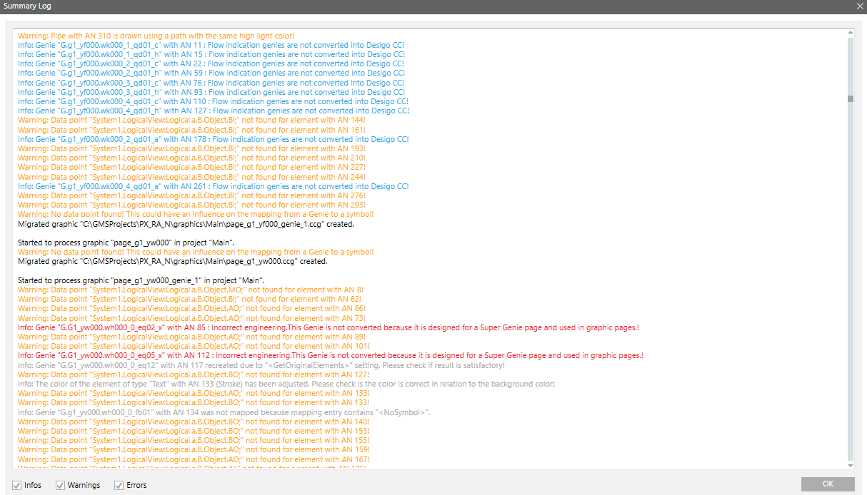 If you still intend to migrate a Super-Genie, press CTRL in the Desigo Graphics Migration tab and click Select Desigo Graphics. This also displays graphics starting with an underscore or exclamation point. Graphics starting with an exclamation point are typically Super-Genie pages.