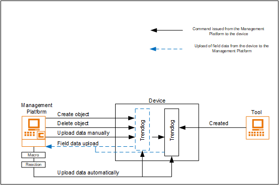 Trendlog or Trendlog multiple objects that are created permanently with the engineering tool cannot be deleted from the Management Platform. In the image above, the Trendlog within the solid black box represents the Trendlog created with the engineering tool.