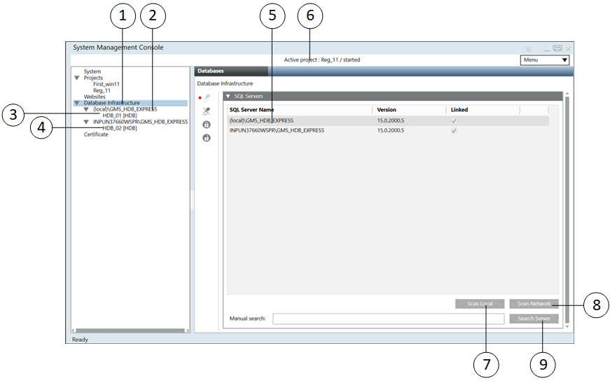 Manual Search | Text field to type server and instance names such as CH1W22332\GMS_HDB_EXPRESS. |