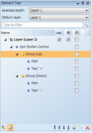 The element tree below illustrates how the above Spin Button command control looks in the Element Tree.
