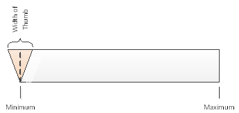 The illustration below is an example of a Slider command and displays the Minimum and Maximum properties and how the thumb lines up with the slider in regards to the width of the thumb.
