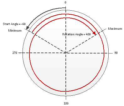 The following drawing shows how the Minimum and the Maximum property values of the Rotator command are placed in conjunction with the Start Angle and Rotational Angle for a total of less than 360 degrees, that is, less than one rotation.