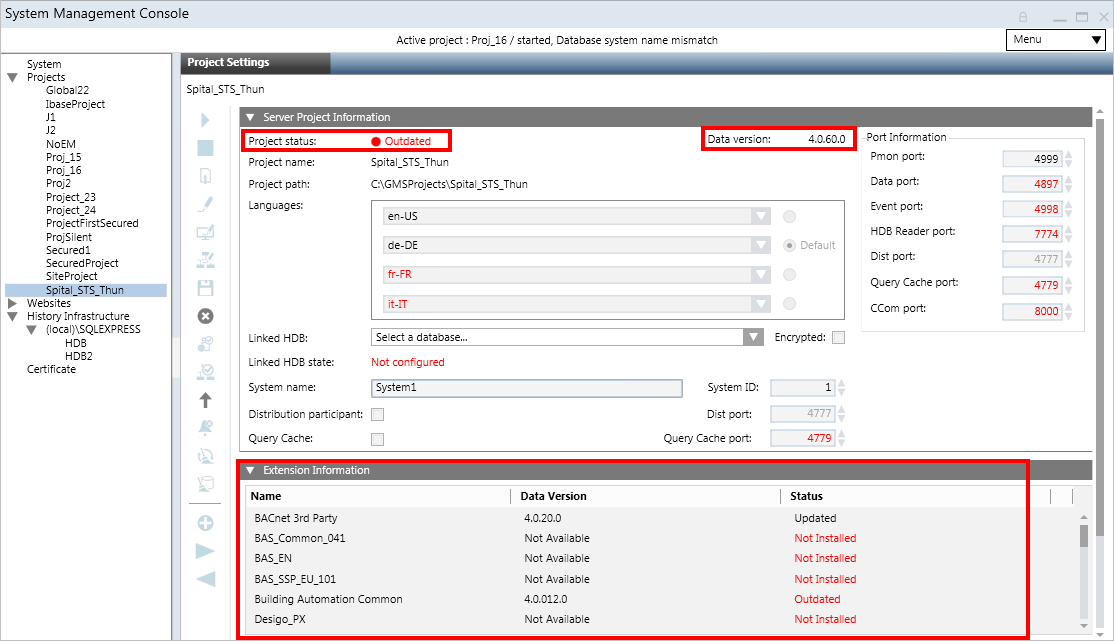 Unknown system(in red) and System ID as0(displays in red) indicates that the restored project has an older data version than the current Desigo CC data version. The system name and system ID of the restored project are displayed on upgrade.