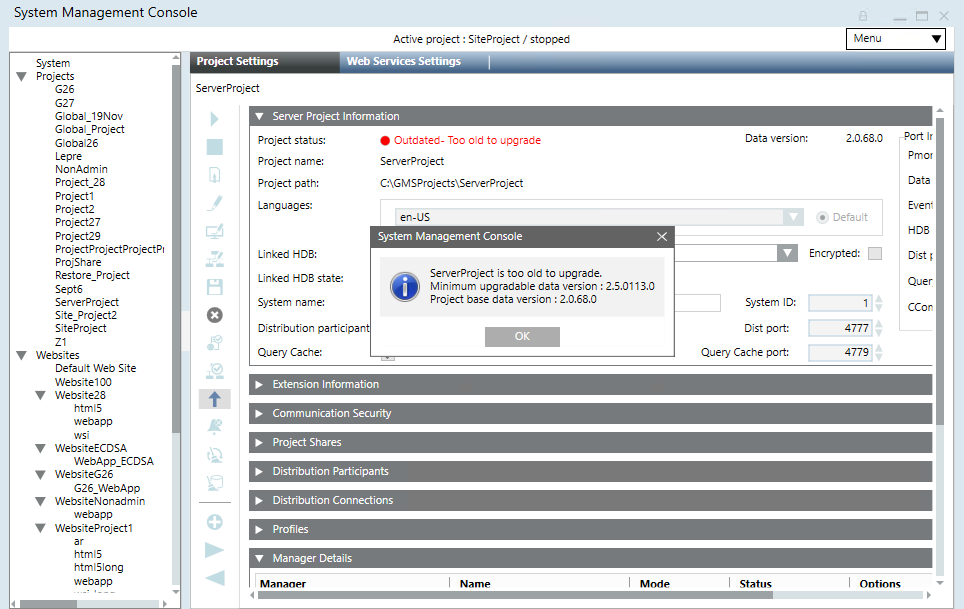 Outdated - Too old to upgrade. When you upgrade such a project, a message informs you accordingly. Currently the default Minimum Upgradable Version is 3.0. - On project upgrade all, the Global libraries are imported and are available.