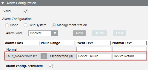 - In the Alarm Configuration expander, deselect the Valid flag in the Valid check box to configure your own Alarm Class to suppress the manual intervention.