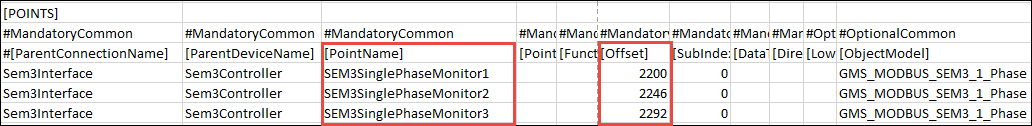 - If you want to configure the offset for the CT rating for each of the EMMM, then you need to mention the internal address for each EMMM as the Offset value for the value.info.meter_CT_rating property for each EMMM in the CSV file. For example, if you want to configure the CT rating for 3 EMMMs (Single-Phase Monitor 1, SEM3 Single-Phase Monitor 2, and SEM3 Single-Phase Monitor 3), then you will have to mention the internal address of the EMMM from the device manual (20142, 20143, 2144) as offset values for the value.info.meter_CT_rating property in the CSV file.