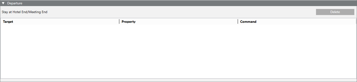 - The Room Automation tab is displayed. Each condition occupies one row, and is comprised of a set of fields (such as Target, Property, Command, and so forth) defining a command that will be issued when the condition is satisfied for a guest’s arrival and departure.