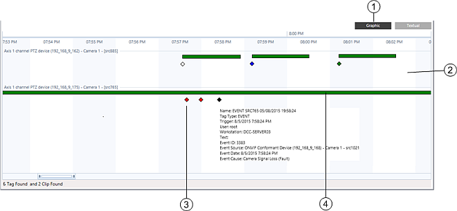 The results of the search display in the timeline section at the bottom of the Video Archive tab. The timeline shows recordings and tags that match the query definition. As in the Timeline in the Contextual pane, you can analyze the query results in both graphical and textual mode.
