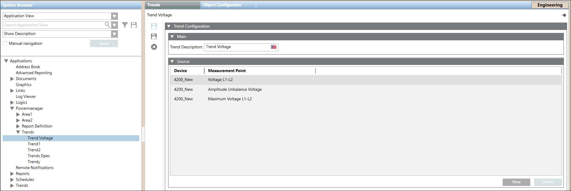 You can configure trends at the system level or for a specific device. In Engineering mode, you can configure trends at the system level in the Trends node.