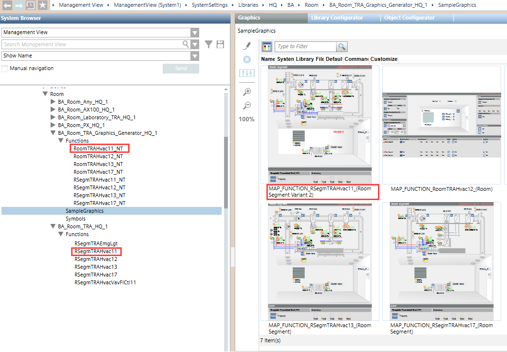 Funktion RSegmTRAHvac11_NT is in folder BA_Room_TRA_Graphcis_Generator_HQ_1. This function is assigned in folder SampleGraphics, graphic page MAP_FUNCTION_RSegmTRAHvac11_(Room Segment Variant x).