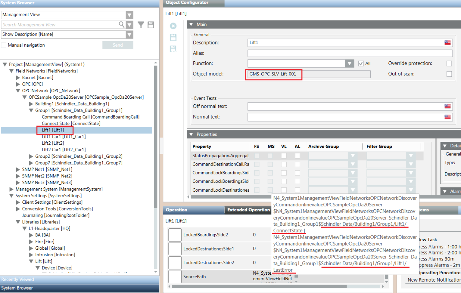 - In line with the library discovery rules, the OPC items highlighted in the figure above are mapped to the different properties of the node “Lift1” of type GMS_OPC_SLV_Lift_001 (see the