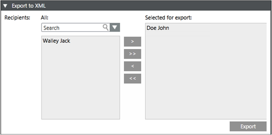 - Selected for export: Displays the recipient users selected for export to an XML file.