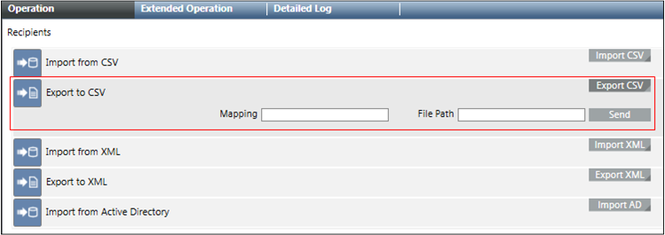 The Export tab allows the user to export recipients to XML and CSV files.