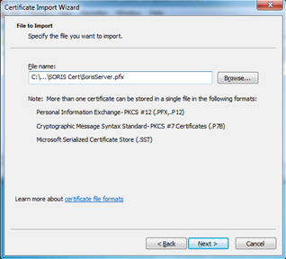 - You want to install the SORISRootCert.cer file and the SORISServerCert.pfx file to the Microsoft Management Console.