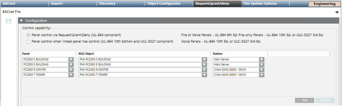 The Request/Grant/Deny tab of the BACnet network contains the fire control ownership options as applicable to the fire panels integrated in Desigo CC.