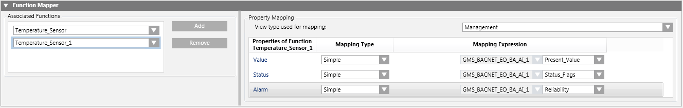 In the Models & Functions tab, the Function Mapper allows you to define which functions are associated with a particular object model. For example, you might have object models for three different devices, as represented in the figure, that must all be mapped to the 'temperature sensor' function. Doing so allows the varying properties defined in each object model to be mapped to consistent properties defined within the function. For background information see Function Mapper Expander.