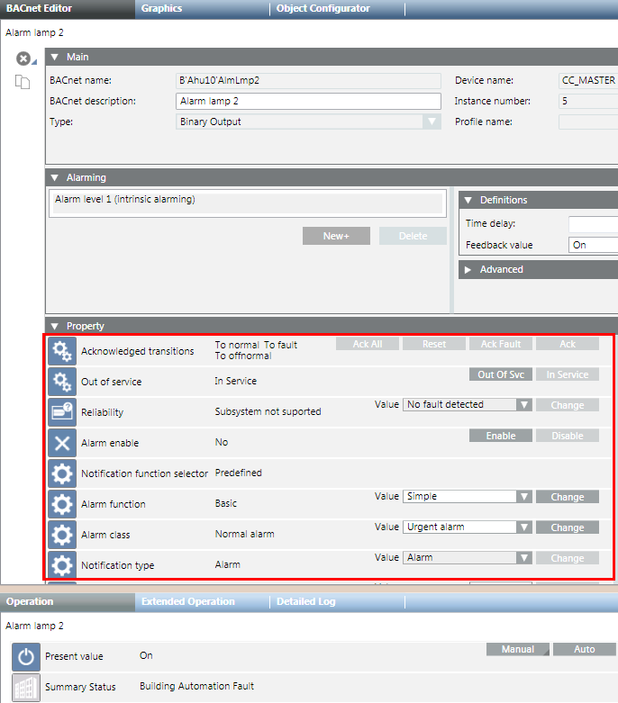 Persist | (Object Models only ) If set, the value of the property is saved in case Desigo CC is stopped and restarted. This option is set for the configuration of properties that must be already have a value assigned at system start-up (for example, the IP address of a control unit to connect). |
