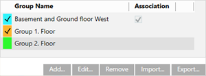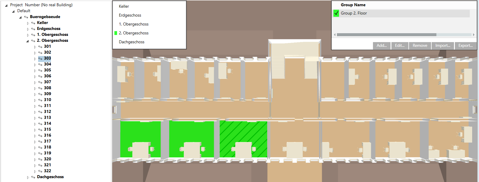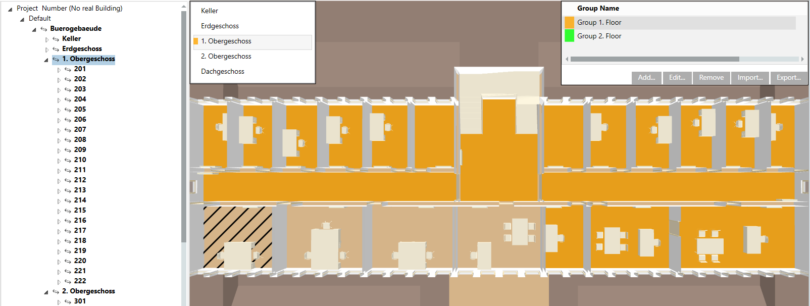 The Room group function merges individual rooms into a group. The groups can be derived from existing connections (for example an air handling unit) specific to the application or can form a purely static group.