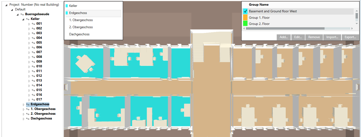Scenario: All rooms connected to air handling unit (AHU) A form a group. AHU A is designed for basement and ground floor west.