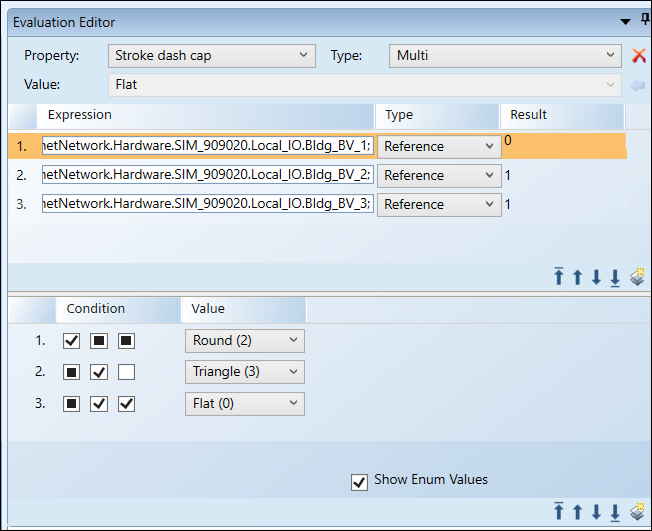 Scenario: You have a Line element on the canvas with the Stroke Dash Cap property applied to it. Depending on the value of a digital data point, you want the dash endings to change to Round, Triangle, or Flat.