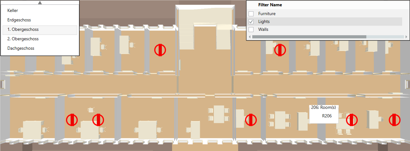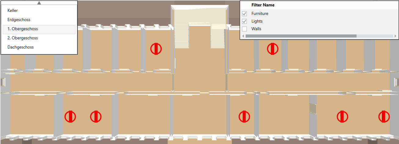 Scenario: You do not want to display all building elements, for example, walls or floors. You can simplify the depiction of the building structure with predefined filters. The filters can be configured accordingly in engineering mode.