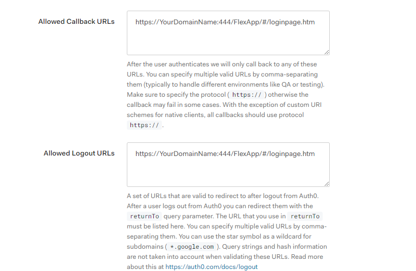 https://{domain name}:444/FlexApp/#/loginpage.htm - Allowed Logout URLs: This field is used by Auth0 to redirect user to a page after successful logout from identity provider.