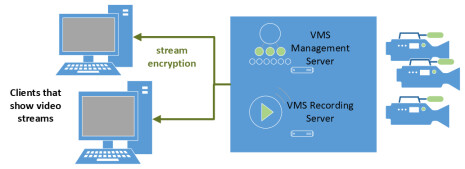 You can encrypt the video streams sent from the VMS to the client stations. You can also encrypt the bidirectional communication between VMS management server and VMS recording server(s), when these are on separate computers.