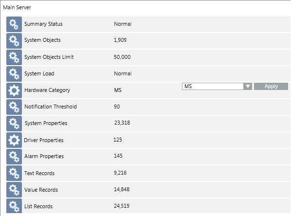 In Engineering mode, when you select the Main Server object in System Browser, information about the hardware category and system limits displays in the Extended Operation tab.