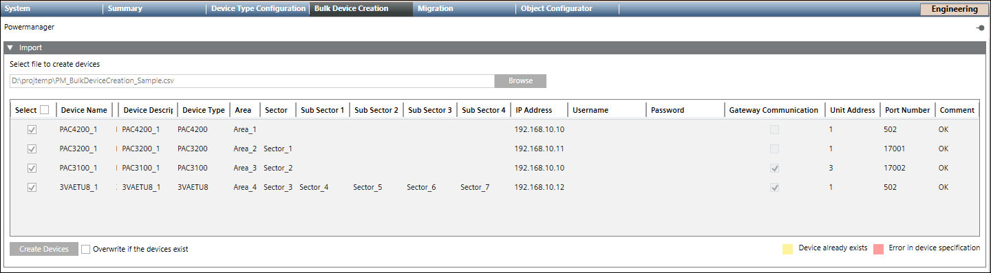 You can create multiple powermanager devices at a single time from the Bulk Device Creation tab in the Engineering mode. To perform a bulk import you must create a CSV file with the details of the devices to be created.