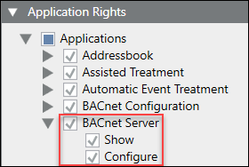 Set User RightsSelect Project > System Settings > Security.In the Application Rights section, expand BACnet Server.Select BACnet Server, and make sure that Show and Configure are also selected.Click Save .