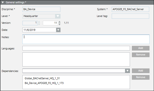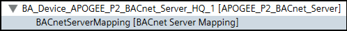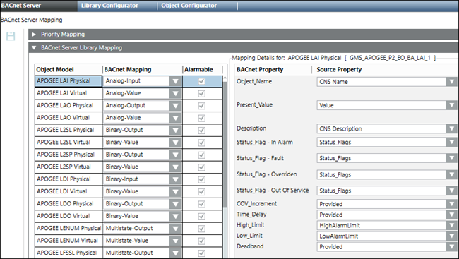 - From the object models folder of the subsystem library, drag and drop object models you want to use with the BACnet server. Map the properties of the BACnet objects to the properties of your source objects. The following image shows an example of mapping to the APOGEE subsystem. You can provide specific values, or you can mark properties as not applicable if your subsystem does not have an equivalent property.