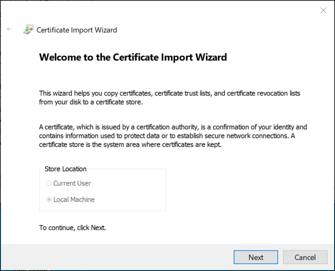 The Welcome to the Certificate Import Wizard dialog box displays.