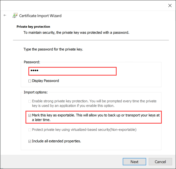 - If there is a password for this certificate, enter it. Select Mark this key as exportable, and then click Next.