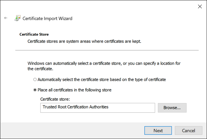 - In the Certificate Store dialog box, accept the default store, and then click Next.