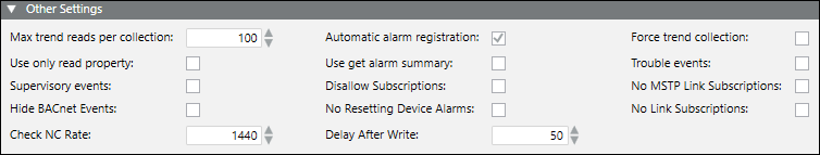 The Other Settings expander displays additional default BACnet device settings, which you can modify.