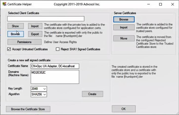 NOTE: This feature might be useful to renew certificates due to expire. - The name of the newly created certificate displays in the Selected Client Certificate field. The new certificate is stored into the UA Applications store, while a certificate with the public key only is exported to a DER file.