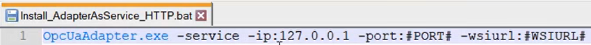 - In C:\Program Files (x86)\Siemens\OPC UA Adapter, open the file Install_AdapterAsService_HTTP.bat with a text editor.