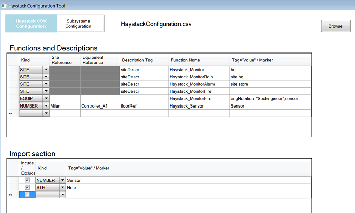 For more information, see Haystack Discovery Rules and CSV Format. - Configure the rules as necessary and click Save As… to save the configuration into the HaystackConfiguration.csv file.