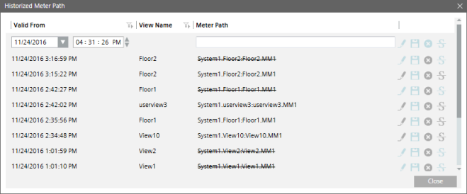 Mark as Deleted | Adds a strikethrough mark for a meter that is no longer associated with a view |