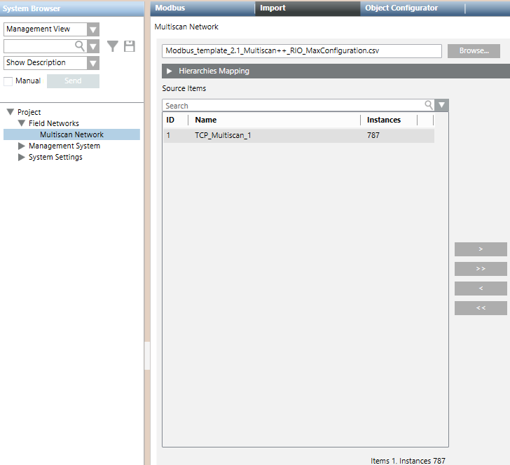 (Optional) In the Hierarchies Mapping expander, define destination in other system views of the data structures (hierarchies contained in the configuration file). The suggested field indicates the correct view root to link for each specific hierarchy. To assign each hierarchy to a destination view, proceed as follows: a. Select the Manual Navigation check box to retain the Import tab. b. In System Browser, select the optional view (logical vieworuser-defined view). c. Drag-and-drop the optional viewroot node from the System Browser tree to the suggested field. NOTE: The hierarchies mapping configuration cannot be modified after the import of the configuration file. For general background information about the Desigo CC import feature and Desigo CC views, see Field Data Import and Views.