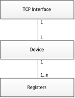 The above relationship can be described as adevice that contains a number of data points and uses a unique TCP interface. The relationship between the communication interface and the device is one-to-one which means that each device has its own TCP interface. However, when a number of Modbus RTU devices are integrated using a TCP gateway, there is only one physical communication interface, which is used by more than one device. In this case, the engineering data still contains a unique interface declaration for each device. A communication interface is a unique combination of an IP address and a slave address. The following example illustrates how a single device and its required registers are assigned in the engineering data.