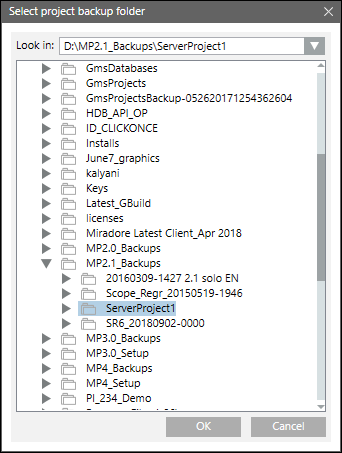 to restore a project backup. In the Select project backup folder dialog box, locate and select the source directory (archive path) and click OK.